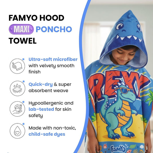 Rexy the Dino – Maxx Series Hooded Poncho Towel for Kids | Quick-Dry, Highly Absorbent Microfiber Bath Towel