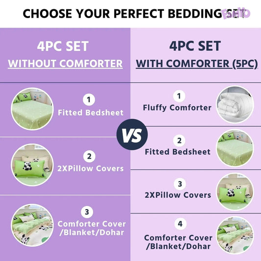 5pc Kids Bed Set – King Size Fitted Bedsheet , Comforter Cover, 2 Pillow Covers & Comforter | Green Panda Theme