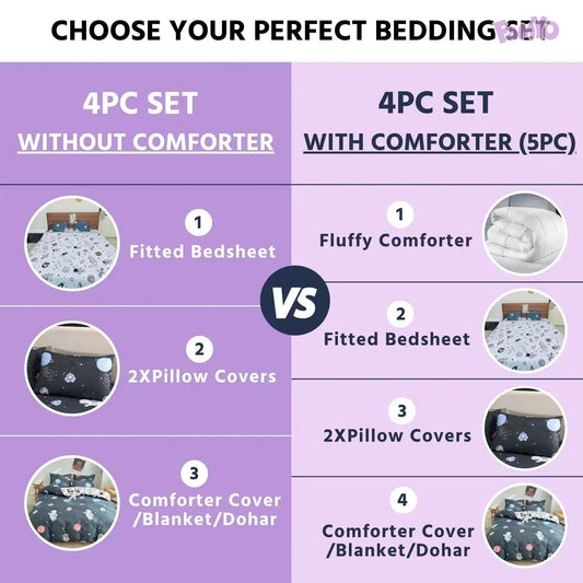 4pc Kids Bed Set – King Size Fitted Bedsheet , Comforter Cover & 2 Pillow Covers | Purple Astronaut Theme