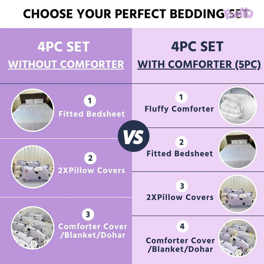 4pc Kids Bed Set – Queen Size Fitted Bedsheet , Comforter Cover & 2 Pillow Covers | Cute Puppy & Flowers