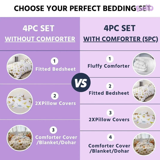 4pc Kids Bed Set – King Size Fitted Bedsheet , Comforter Cover & 2 Pillow Covers | Dino Park Theme
