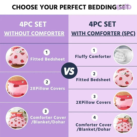 4pc Kids Bed Set – King Size Fitted Bedsheet , Comforter Cover & 2 Pillow Covers | Strawberry Pink Theme