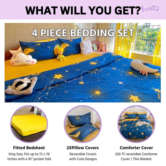 4pc Kids Bed Set – King Size Fitted Bedsheet , Comforter Cover & 2 Pillow Covers | Moon & Star Theme