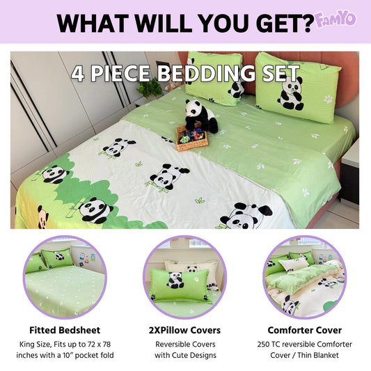 4pc Kids Bed Set – King Size Fitted Bedsheet , Comforter Cover & 2 Pillow Covers | Green Panda Theme