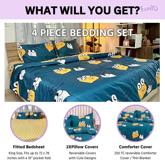 4pc Kids Bed Set – King Size Fitted Bedsheet , Comforter Cover & 2 Pillow Covers | Cute Smiles Theme
