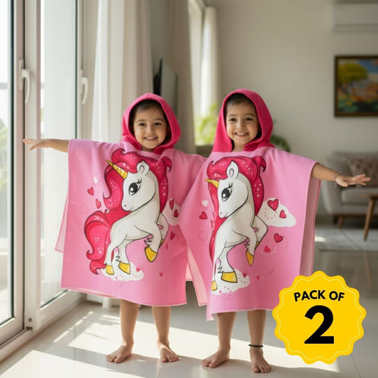 Set of 2 – Famyo Pink Unicorn Poncho Bath Towels for Kids (1–7 Years) | Quick-Drying Microfiber Hooded Towels | Perfect for Bath, Beach & Gifting