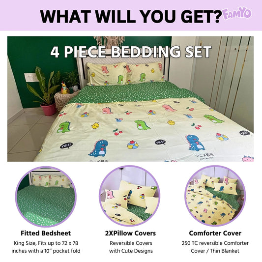 4pc Kids Bed Set – King Size Fitted Bedsheet , Comforter Cover & 2 Pillow Covers | Cute Dino Theme