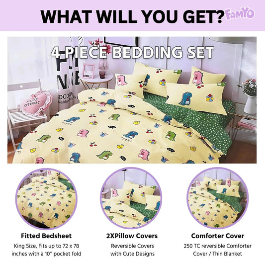 5pc Kids Bed Set – King Size Fitted Bedsheet , Comforter Cover, 2 Pillow Covers & Comforter | Cute Dino Theme