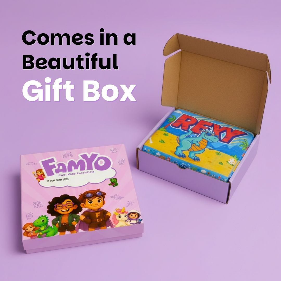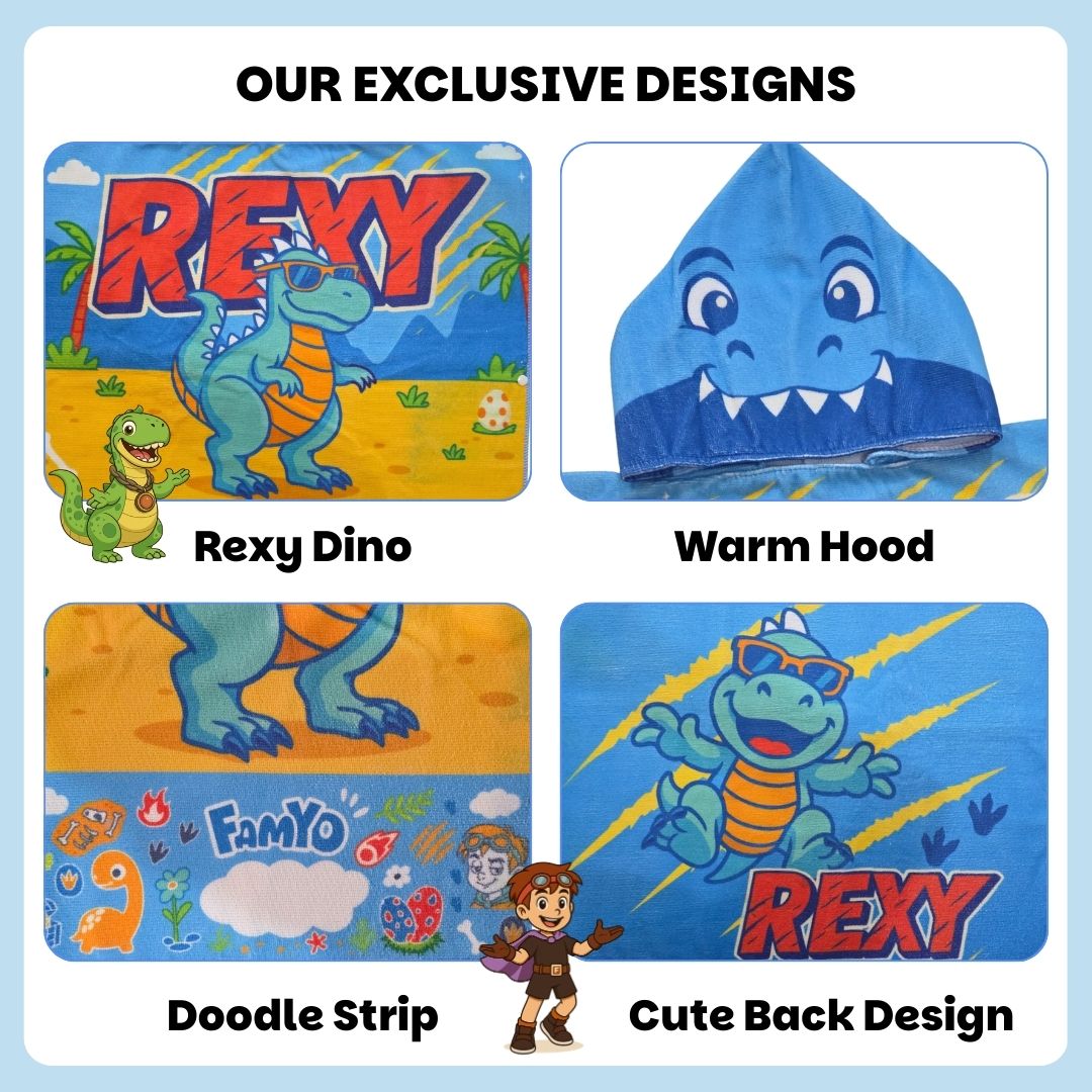 Bath time, pool time, or sandy beach play — every moment becomes more fun with the Rexy the Dino Hood Maxx Poncho Towel, Famyo’s premium hooded towel for kids crafted for softness, comfort, and all-day excitement.